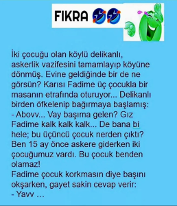 İki çocuğu olan köylü delikanlı, askerlik görevini tamamlayıp köyüne dönmüş. Eve geldiğinde bir de ne görsün? Karısı Fadime üç çocukla bir masanın çevresinde oturuyor… Delikanlı istemeden öfkelenip bağırmaya başladı: – Abovv… Vay talep etmeyen gelen mi? Gız Fadime kalk kalk kalk… De bana bi hele: bu üçüncü çocuk Nereden çıktı? Ben 15 ay önce askere giderken iki çocuğumuz vardı. Bu çocuktan olamaz! Fadime çocuktan korkmasın diye başını okşarken, neşeli sakin cevap verir…