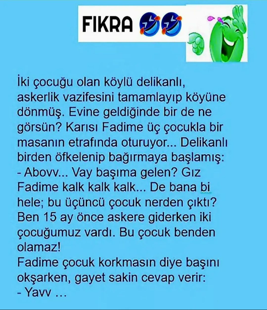 İki çocuğu olan köylü delikanlı, askerlik görevini tamamlayıp köyüne dönmüş. Eve geldiğinde bir de ne görsün? Karısı Fadime üç çocukla bir masanın çevresinde oturuyor… Delikanlı istemeden öfkelenip bağırmaya başladı: – Abovv… Vay talep etmeyen gelen mi? Gız Fadime kalk kalk kalk… De bana bi hele: bu üçüncü çocuk Nereden çıktı? Ben 15 ay önce askere giderken iki çocuğumuz vardı. Bu çocuktan olamaz! Fadime çocuktan korkmasın diye başını okşarken, neşeli sakin cevap verir…