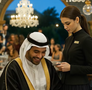 Salon kahkahaya boğulmuştu. Garson sessizliğini korurken, şeyh onun Arapçayı anlamadığına inanıyordu. Derken, bir anda tepsiyle masaya ilerleyen kadın, mükemmel Arapçayla şu sözleri dile getirdi: